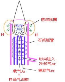 炬管由三層同軸石英管組成,最外層石英管通冷卻氣(Ar氣),沿切線方向引入,并螺旋上升,其作用:將等離子體吹離外層石英管的內壁,可保護石英管不被燒毀;同時,這部分Ar氣同時也參與放電過程。中層石英管通入Ar氣(工作氣體),起維持等離子體的作用。內層石英管內徑為1 -2mm左右,以Ar為載氣,把經過霧化器的試樣溶液以氣溶膠形式引入等離子體中。